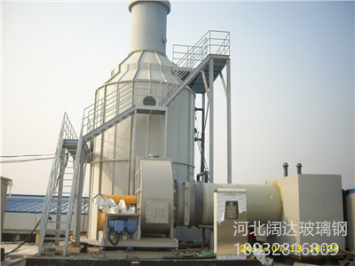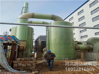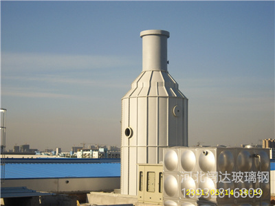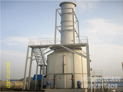 玻璃鋼酸霧凈化塔分單塔體和雙塔體。采用圓形塔體,用法蘭分段聯接而成。具體由貯液箱、塔體、進風段、噴淋層、填料層、旋流除霧層、出風錐帽、觀檢孔等組成。